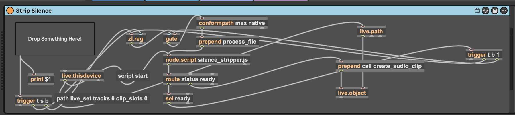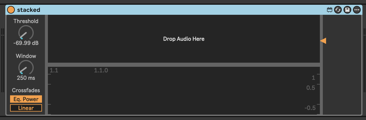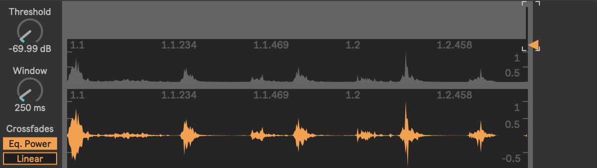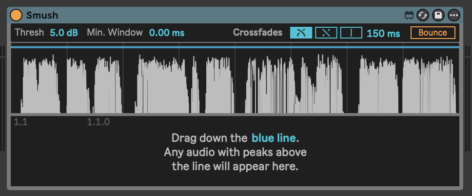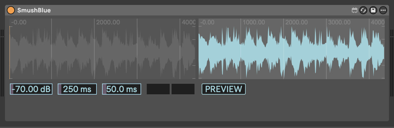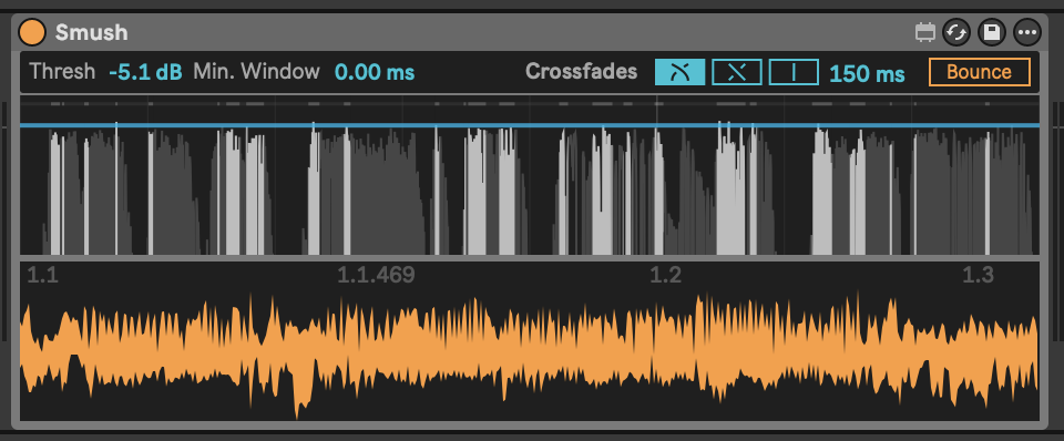 Over the course of its development, I have called MF01 Smush, among other names. With it, you can load a sample, set a dB threshold, and it will instantly join the remaining audio segments with crossfades to create a smooth, condensed clip, which you can bounce to an audio track.