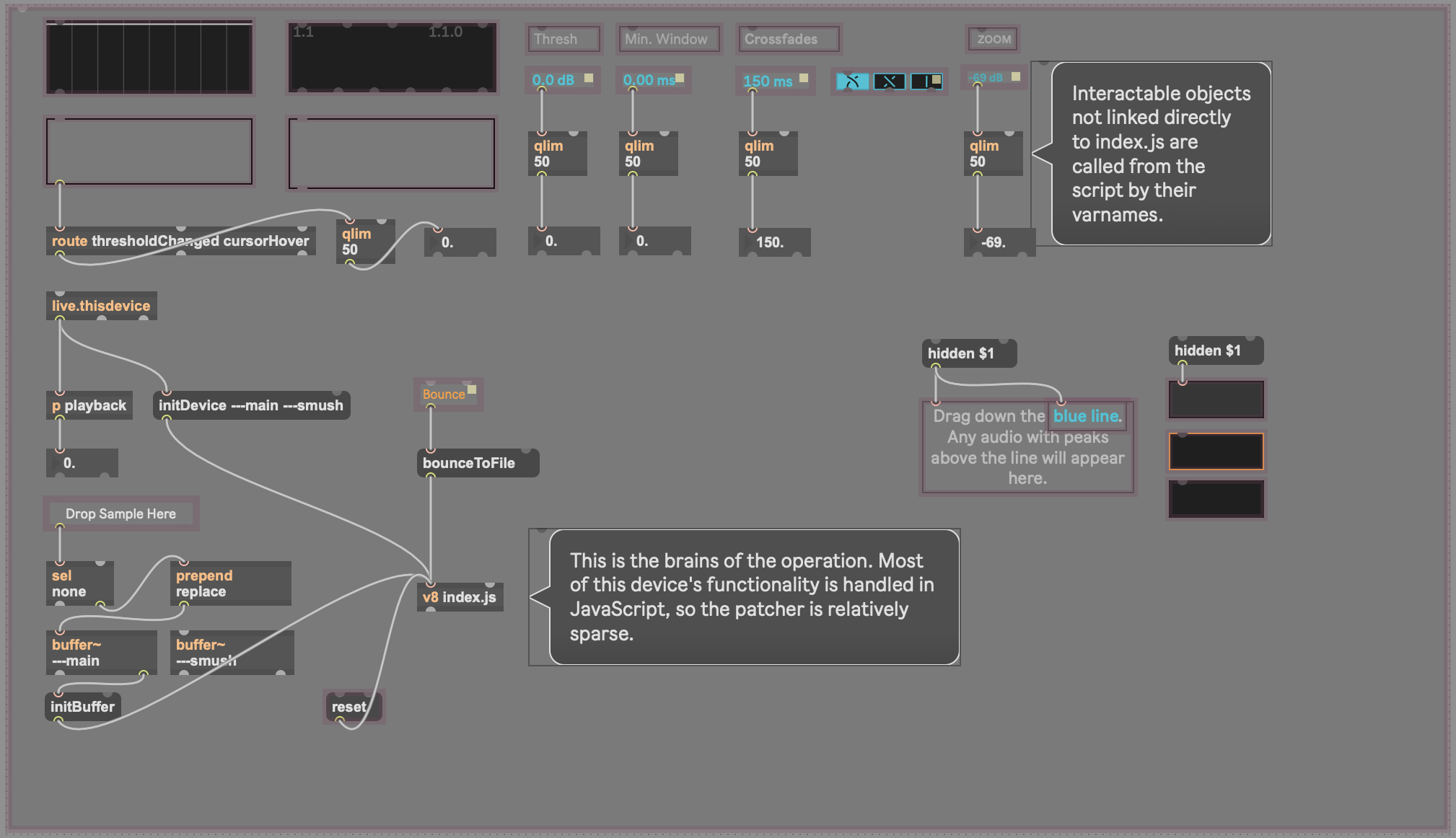 index.js: 353 linesstate.js: 216 linessmush.js: 292 linesfindAudioRegions.js: 109 linesaudioBouncer.js: 380 linesbufferManager.js: 120 linesmaxObjectManager.js: 265 linesmainGraphics.js: 243 linessmushGraphics.js: ~90 linesgetBufferMinMax.js: ~60 lines